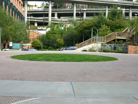 The round-about is red brick, with grass growing in the middle. | |