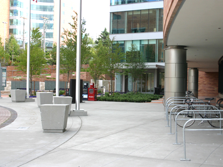 Just past the landscaping is a green sign identifying the building. | |