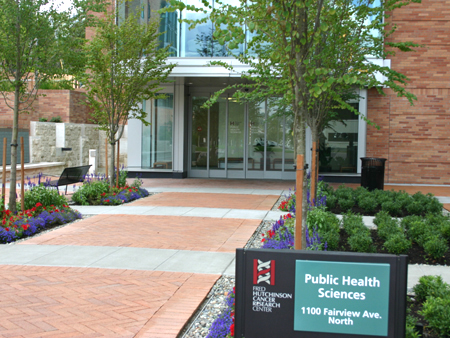 with the PHS Building to your right. In the distance, you'll see another FHCRC sign directing you to turn right at the next corner. |